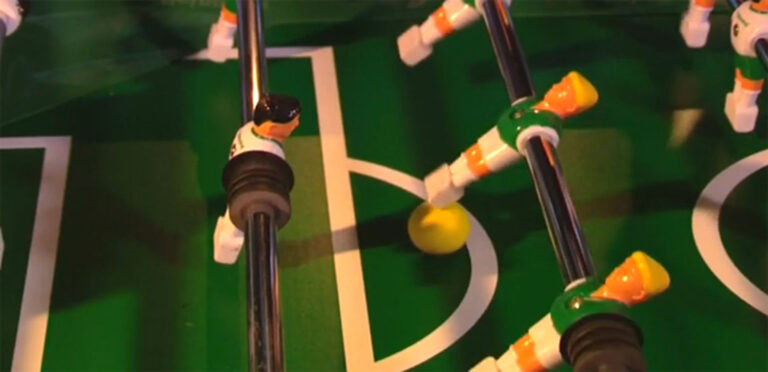 Tipos de Mesa As mesas profissionais se diferenciam pelo material do boneco, pela precisão na realização de chutes e passes, tal como na formação dos “jogadores”. Enquanto nas mesas não profissionais, popularmente chamadas no Brasil de “mesas canoas”, a formação dos bonecos de linha é, normalmente, a 3-4-3, na mesa profissional se utiliza a formação 2-5-3, valorizando assim o número de bonecos no meio de campo do jogo. Vários são também os modelos de mesas profissionais, sendo a americana “Tornado” e a alemã “Leonhart” dois dentre os mais conhecidos. Como jogar Pebolim? O jogo de pebolim pode ser disputado individualmente ou em duplas com o objetivo de marcar 10 gols numa partida única ou 5 (cinco) gols numa partida com melhor de 3 (três) partidas e quem vencer duas das três partidas é a dupla vencedora. Tempo ou quantidade de gol? Depende da regra que for utilizar. Nas regras oficiais são por quantidade de gols, cronometrando o tempo de posse de bola. Mas para cada torneio ou campeonato extraoficial pode ser adotado a regra acordada entre os participantes.